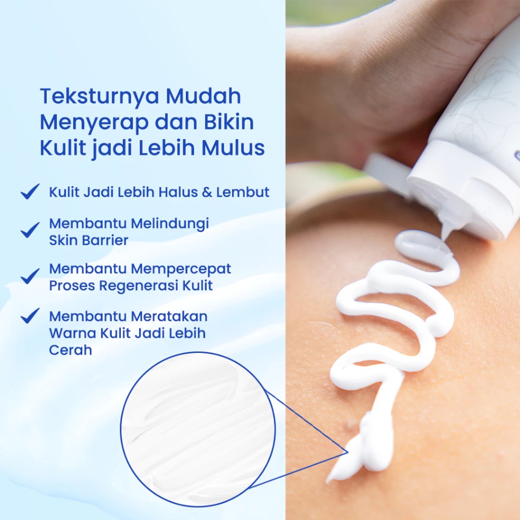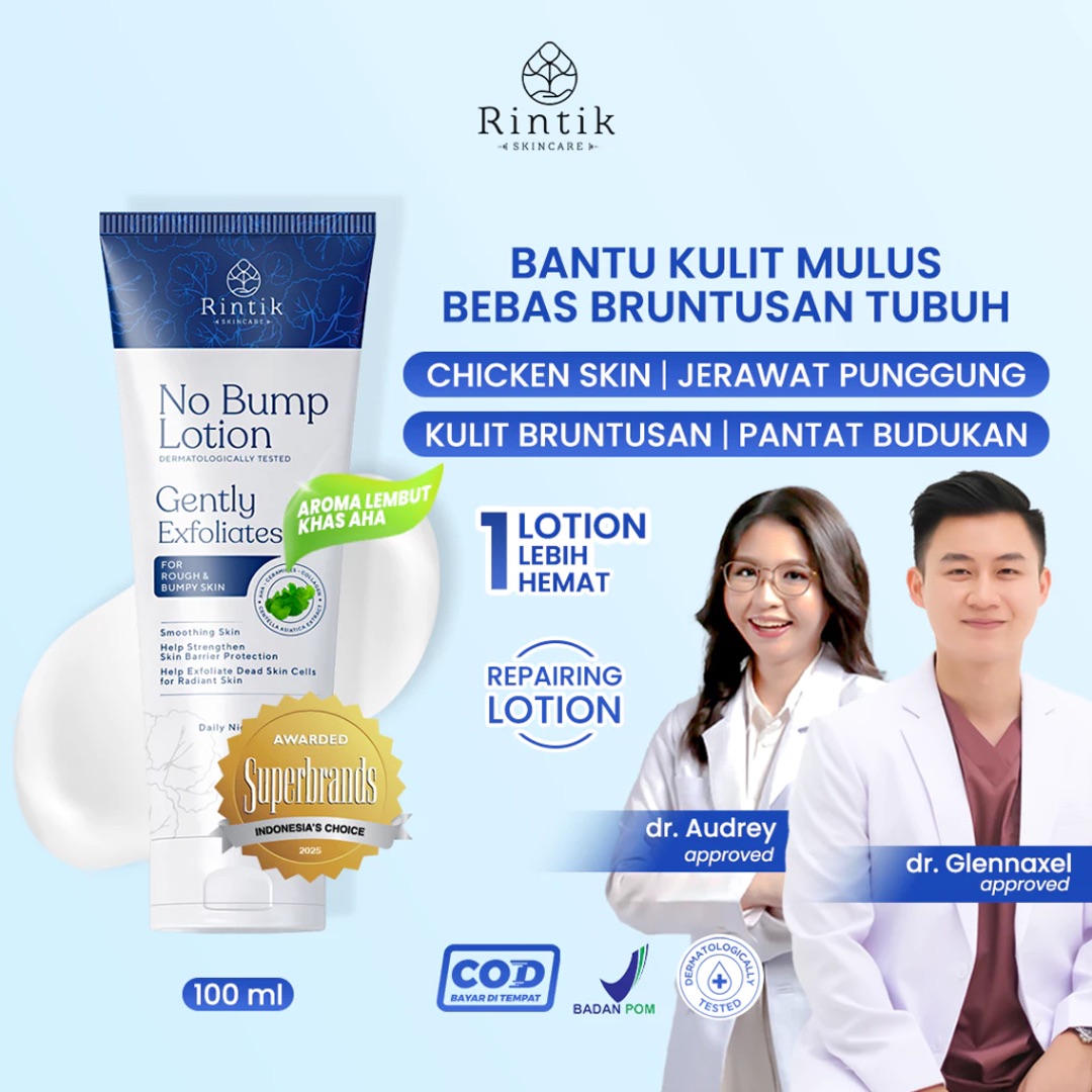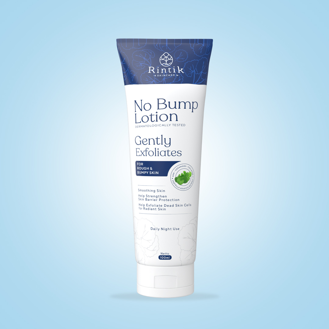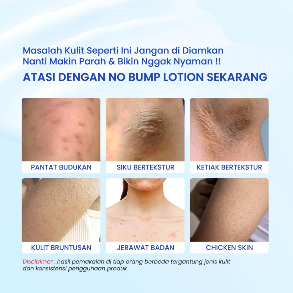 No Bump Lotion (Hanya untuk tubuh) dengan aroma lembut khas AHA, No Bump Lotion membantu mengatasi kulit bruntusan, chicken skin, kulit kasar, jerawat punggung (back acne), dan kulit budukan. Lotion ini bekerja dengan cara mengoptimalkan proses eksfoliasi alami pada kulit tubuh untuk mengangkat sel kulit mati yang menumpuk, sehingga kulit tampak lebih cerah. Selain itu, membantu melindungi skin barrier, melembapkan, serta meregenerasi sel kulit baru agar kulit menjadi lebih sehat.